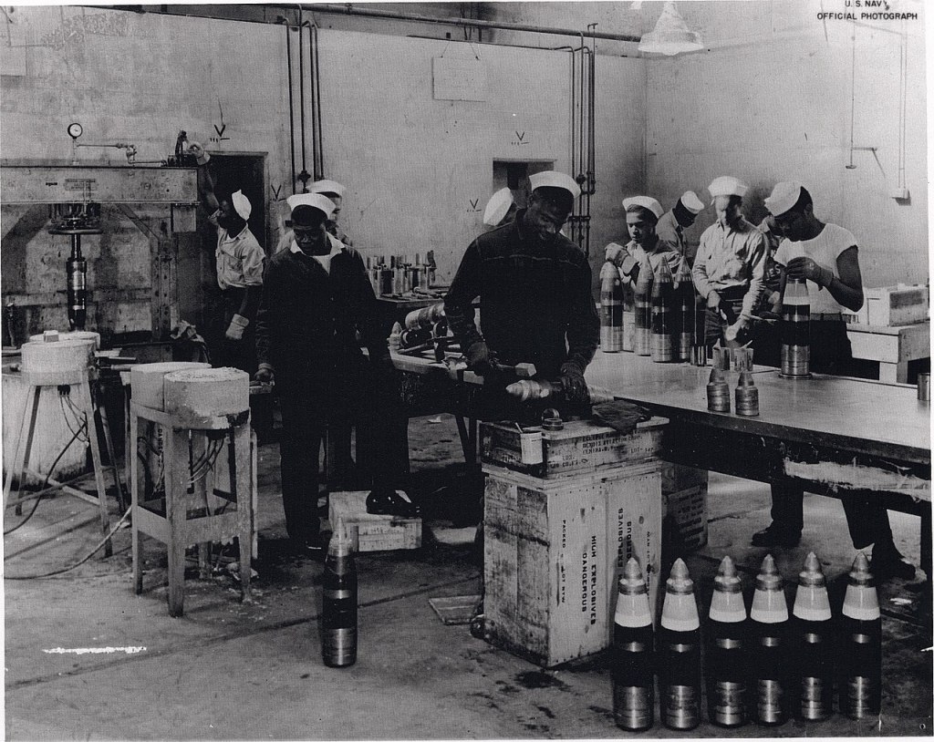 Image: African American sailors of an ordnance battalion preparing 5-inch shells for packing at the Port Chicago Naval Magazine in 1943. Wikimedia Commons.