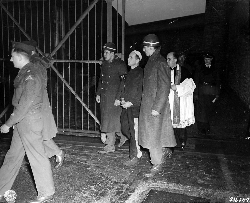 Image: Five Germans were condemned to death for the killing of six American flyers, who were seized from their German military captors. Joseph Harzgen is led to execution by hanging at Bruchsal, Germany. (Wikimedia Commons.)