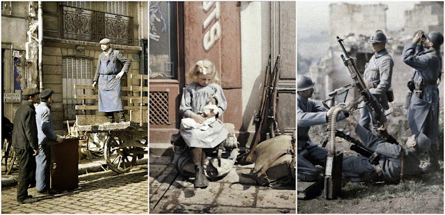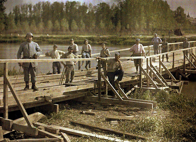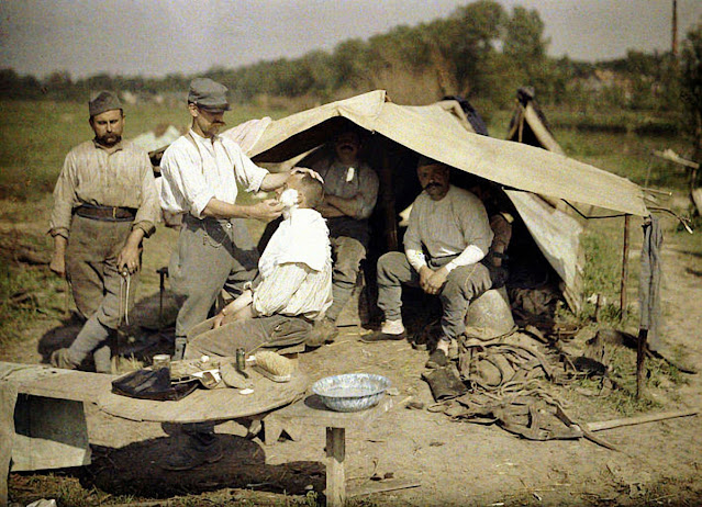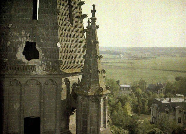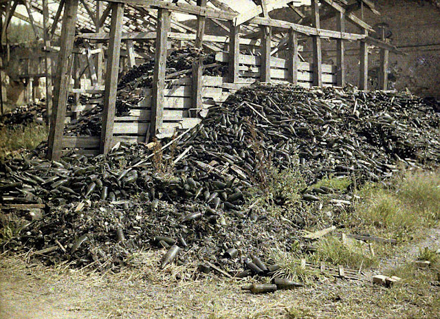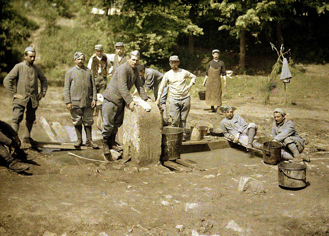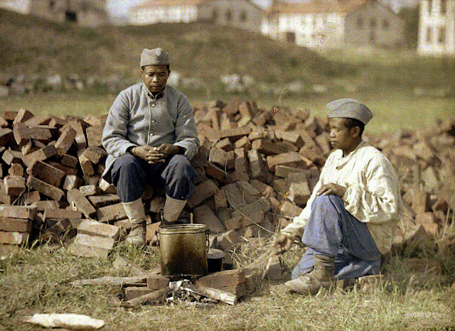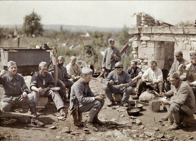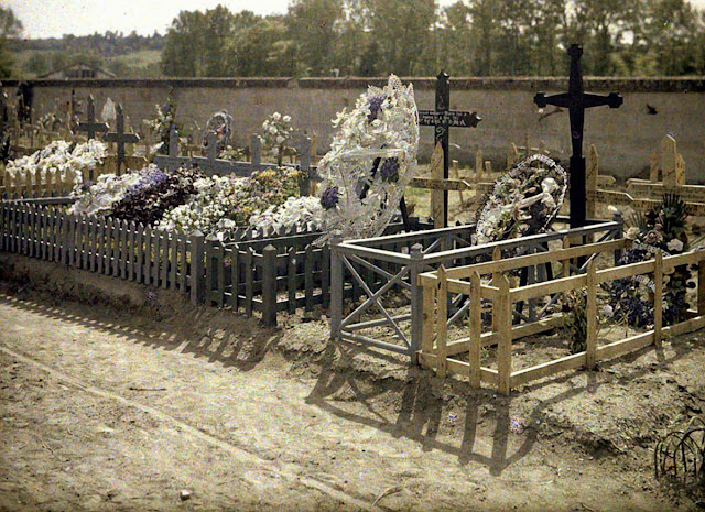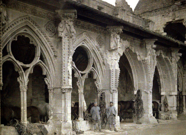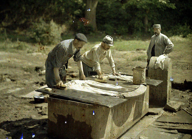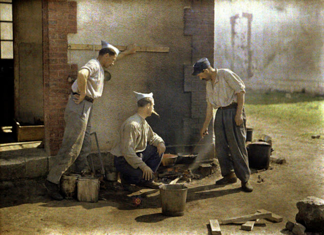 Serving in the French Army, photographer Fernand Cuville (1887–1927) continued the autochromists’ tradition of recording the world around them in great detail. These color photographs were taken by Cuville in 1917. His photos capture French soldiers in everyday situations, including cleaning their clothes and eating lunch. They also show war’s destruction in scenes of crumbling buildings and ruined landscapes.