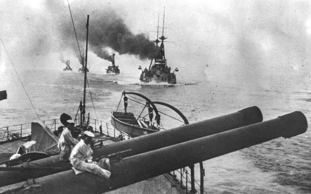The Japanese fleet off the coast of China in 1914. Japan sided with the United Kingdom and its allies, attacking German interests in the Pacific, including island colonies and leased territories on the Chinese mainland.