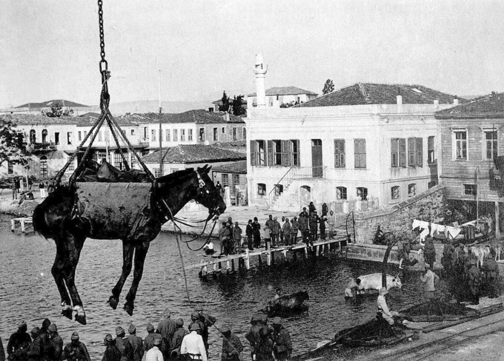 Unloading of a horse in Tschanak Kale, Turkey, equipment for the Austro-Hungarian army.