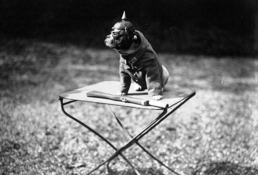 A dog belonging to a Mr. Dumas Realier, dressed as a German soldier, in 1915.