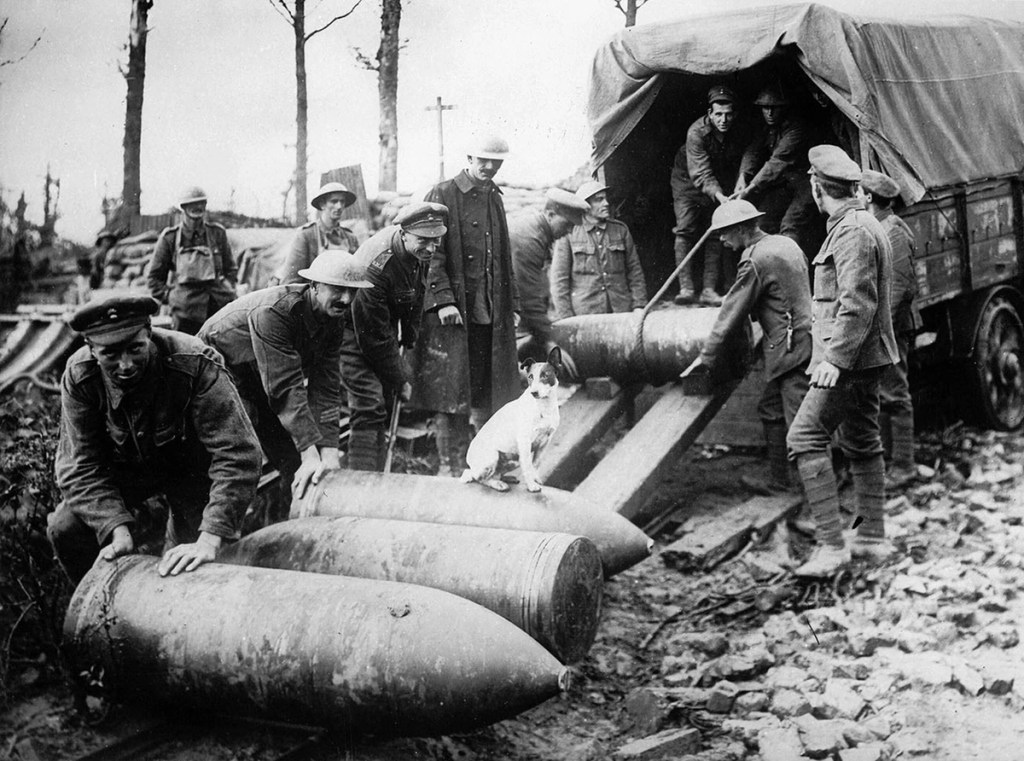 “Pill box demolishers” being unloaded on the Western Front. These enormous shells weighed 1,400 lbs. Their explosions made craters over 15 ft. deep and 15 yards across.