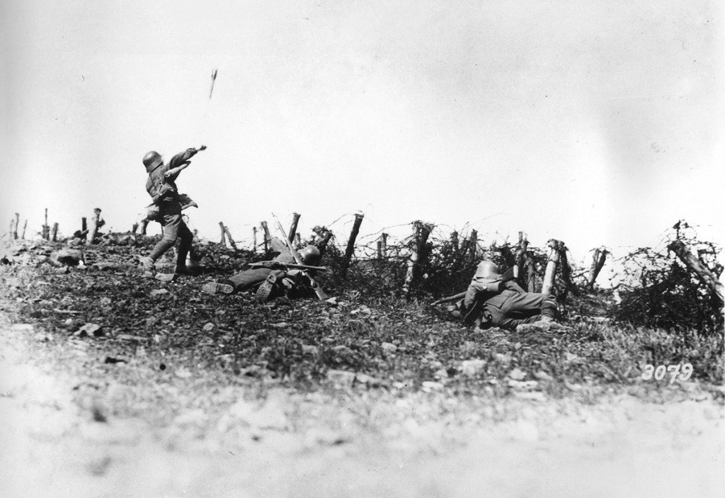 A German soldier throws a hand grenade against enemy positions, at an unknown battlefield during World War I.