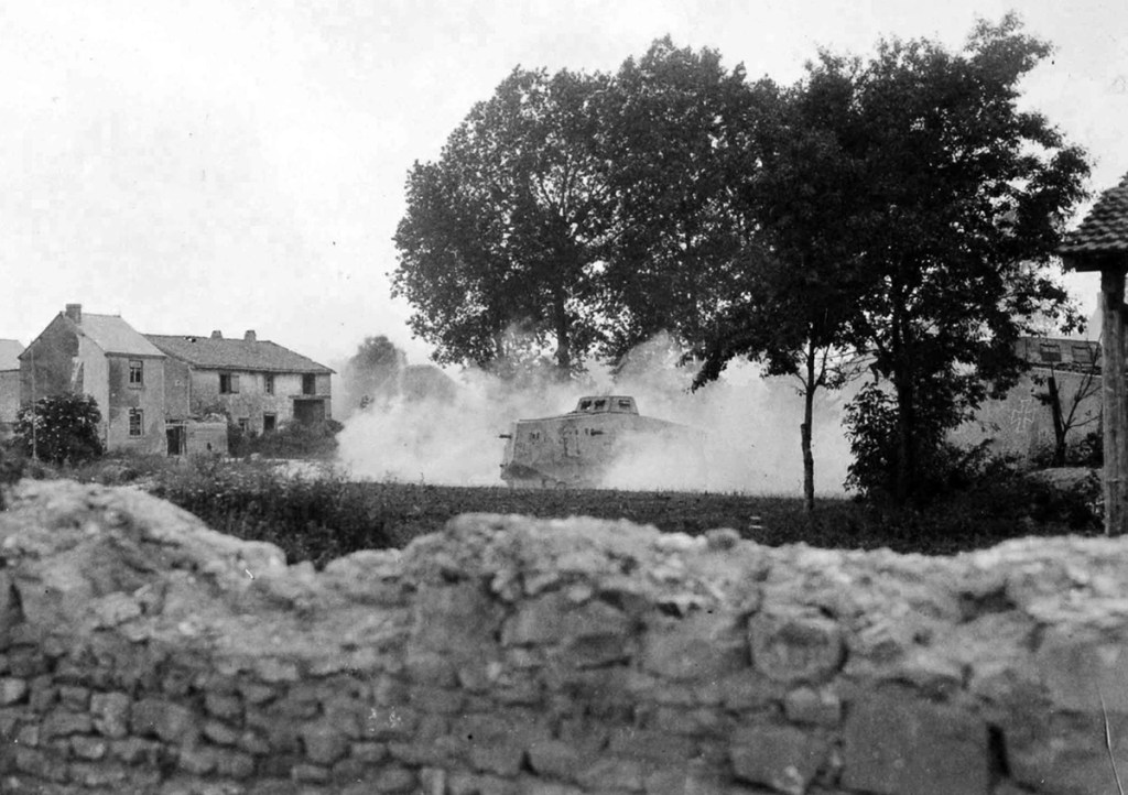 Western Front, German A7V tanks drive through a village near Rheims in 1918.