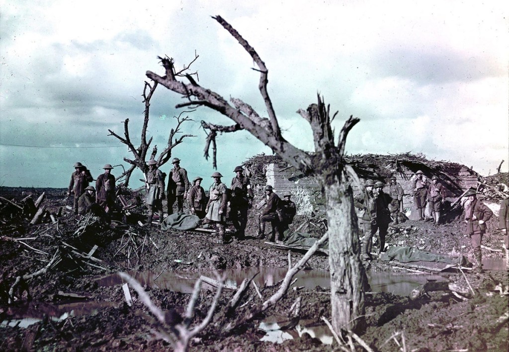 A color photograph of Allied soldiers on a battlefield on the Western Front. This image was taken using the Paget process, an early experiment in color photography.