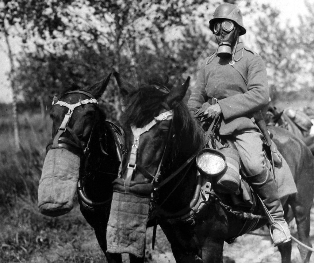 A German ammunition column, men and horses equipped with gas masks, pass through woods contaminated by gas in June of 1918.