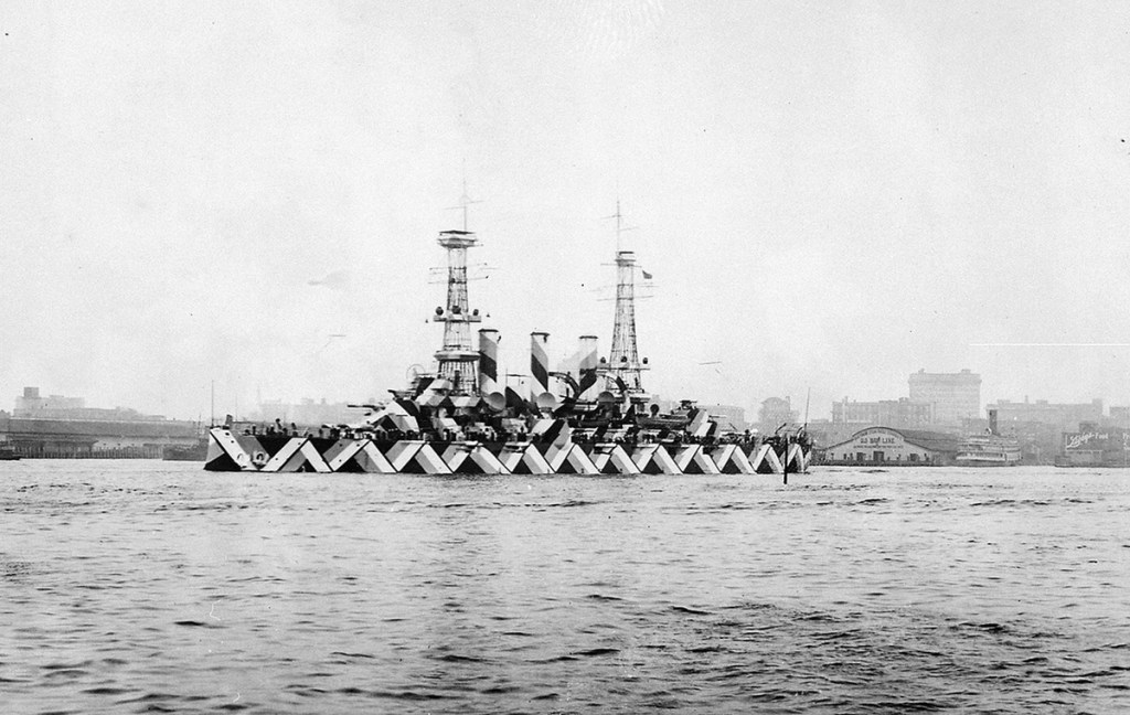 The USS Nebraska, a United States Navy battleship, with dazzle camouflage painted on the hull, in Norfolk, Virginia, on April 20, 1918. Dazzle camouflage, widely used during the war years, was designed to make it difficult for an enemy to estimate the range, heading, or speed of a ship, and make it a harder target.