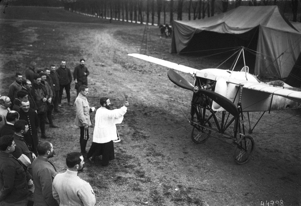 The conflict, called the Great War by those involved, was the first large-scale example of modern warfare – technologies still use in battle today were introduced in large scale forms then, some (like chemical attacks) were outlawed and later viewed as war crimes. The newly-invented aeroplane took its place as an observation platform, a bomber, and an anti-personnel weapon, even as an anti-aircraft defense, shooting down enemy aircraft. Here, French soldiers gather around a priest as he blesses an aircraft on the Western Front, in 1915.