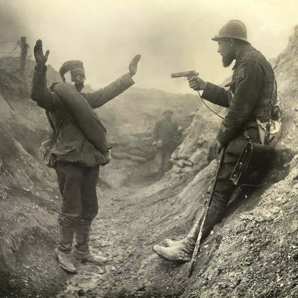 Image: French Zouave Captain holding a wounded German soldier at gunpoint at Mt. Cornillet during the Battle of the Hills, May 1917.