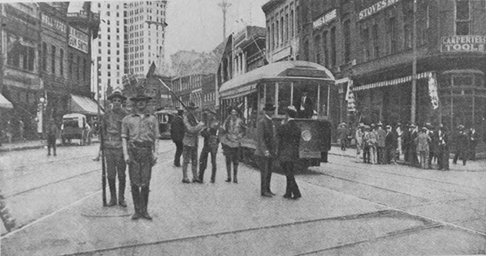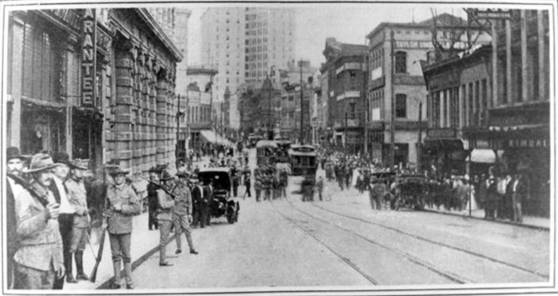 Image: View of the Georgia State militia in the aftermath of race riots on Peachtree Street just south of Five Points during the 1906 Atlanta Race Massacre.