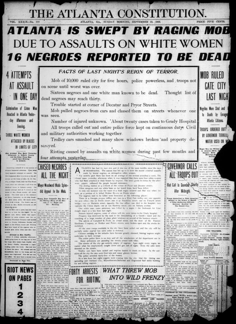 Image: Front page of the September 23, 1906, issue of The Atlanta Constitution, dedicated to coverage of the 1906 Atlanta race massacre.